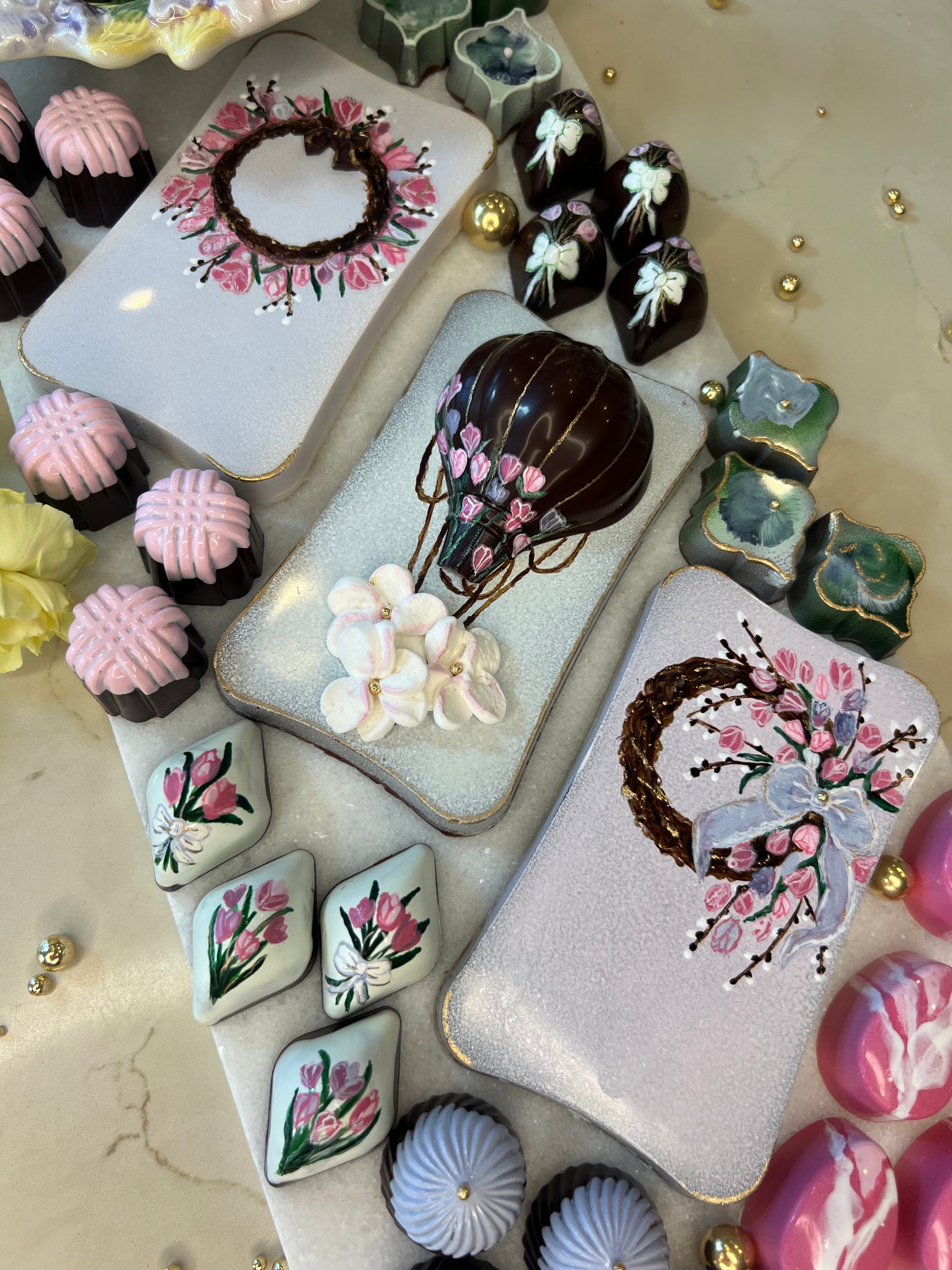 Luxury chocolate tray designed to elevate celebrations, receptions, and dessert tables. Includes 50 artisan bonbons and 6 hand-painted chocolate bars, crafted with premium Belgian and Swiss chocolate.